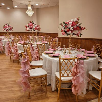 Event space rental includes tables (60-inch round, 6ft rectangle, cocktail), Chiavari chairs (gold and white), setup and breakdown of our tables and chairs, lobby, full stationed bar, dressing rooms, dance floor, and free parking. We give 2 hours free for setup and another 1 hour free for breakdown.